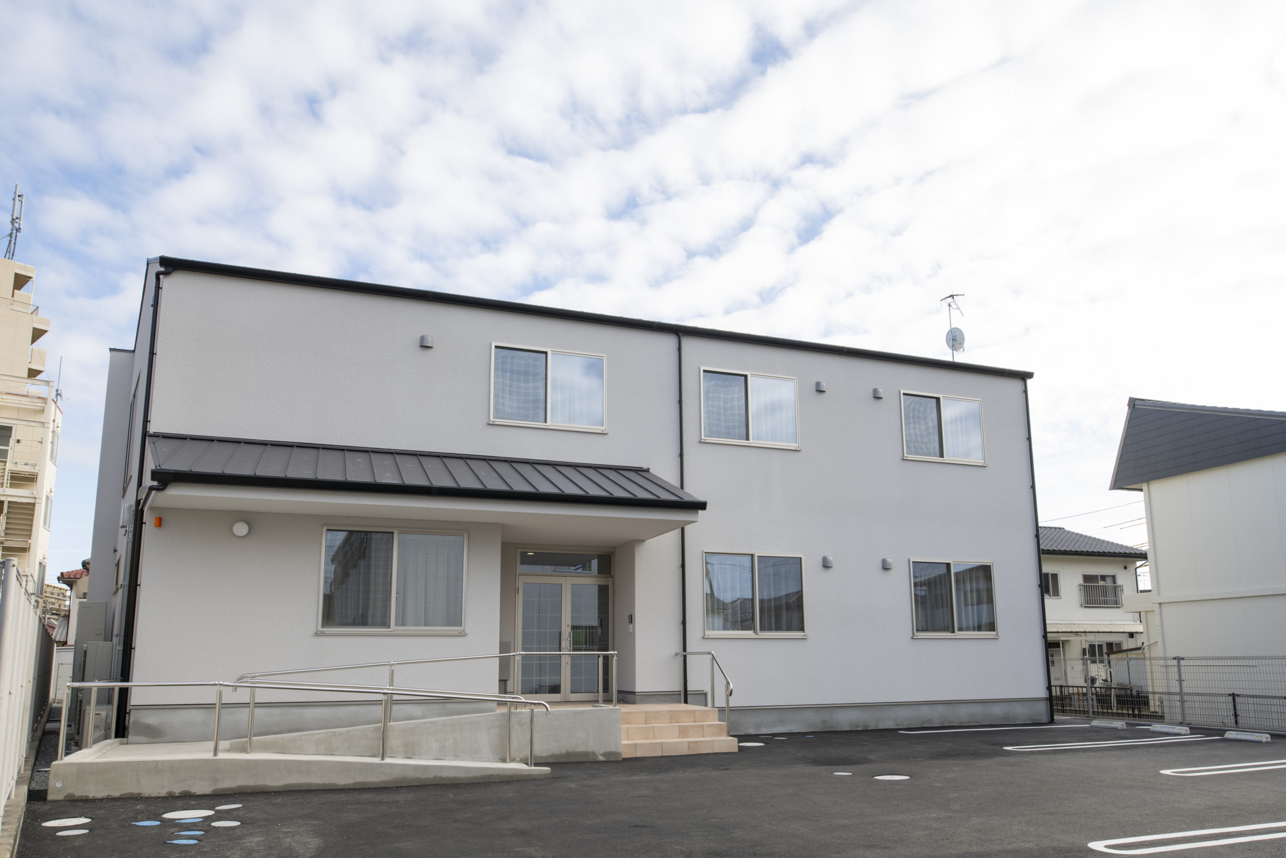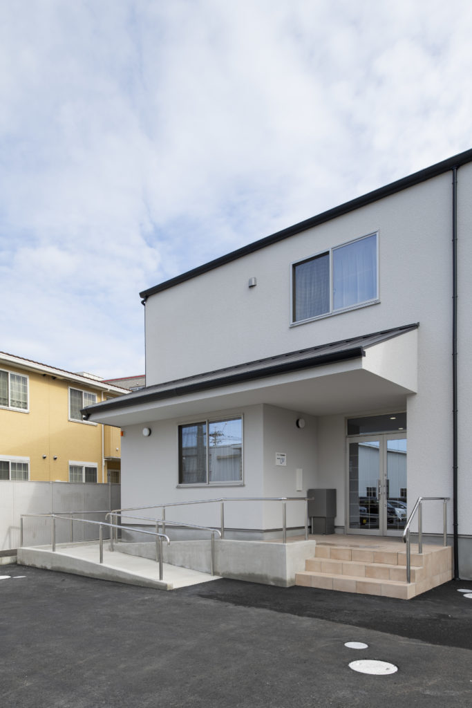 めやす箱様のグループホームが完成いたしましたので完成写真をUPいたします。 白を基調とした外壁に小さいながら中庭を設けた空間をデザインさせていただきました。 利用者様の癒しの空間になれば幸いです。