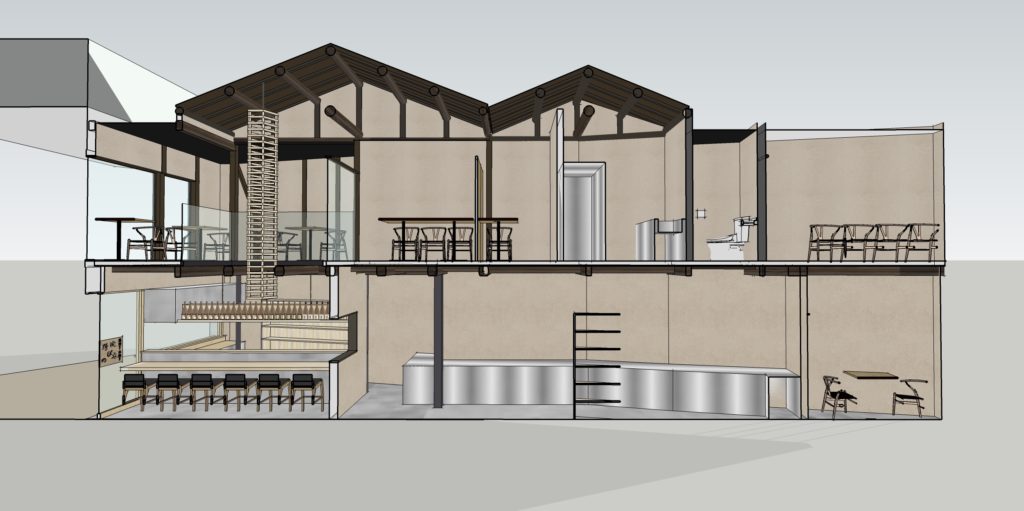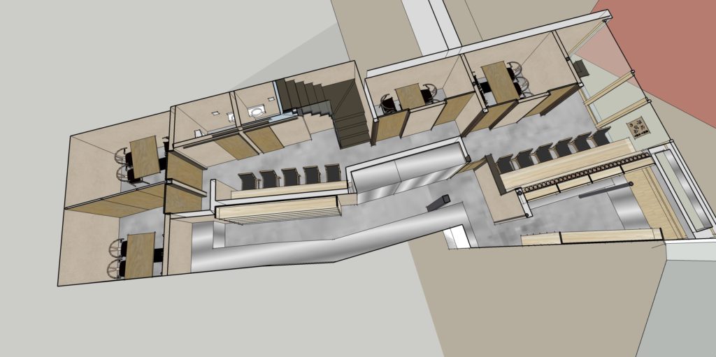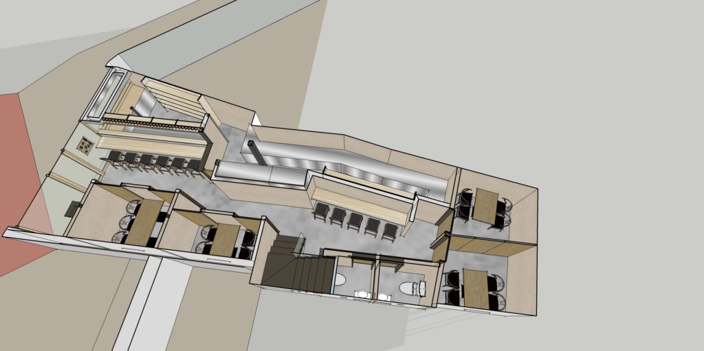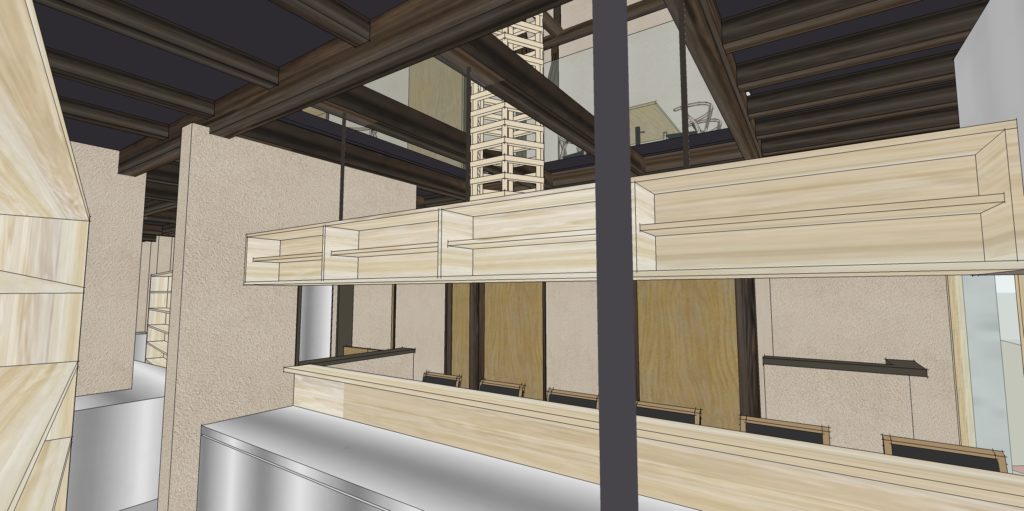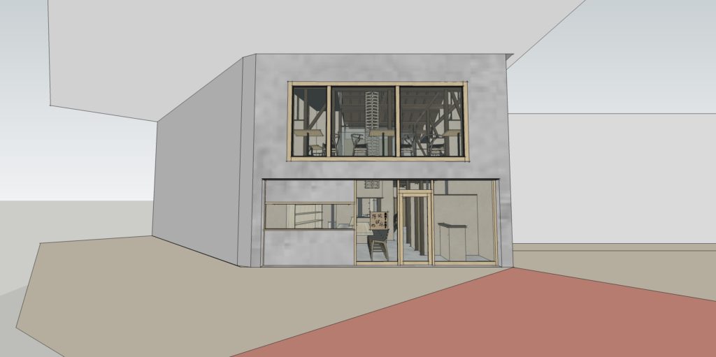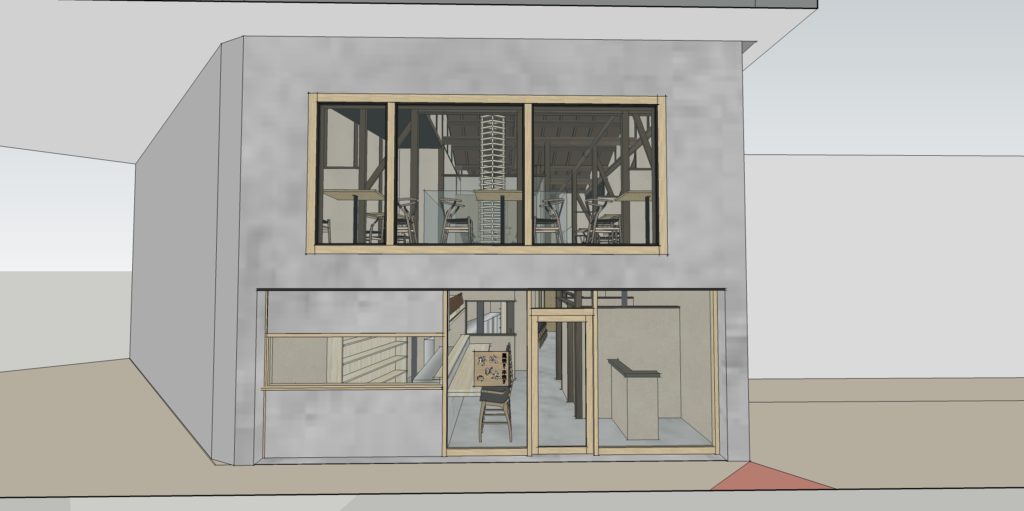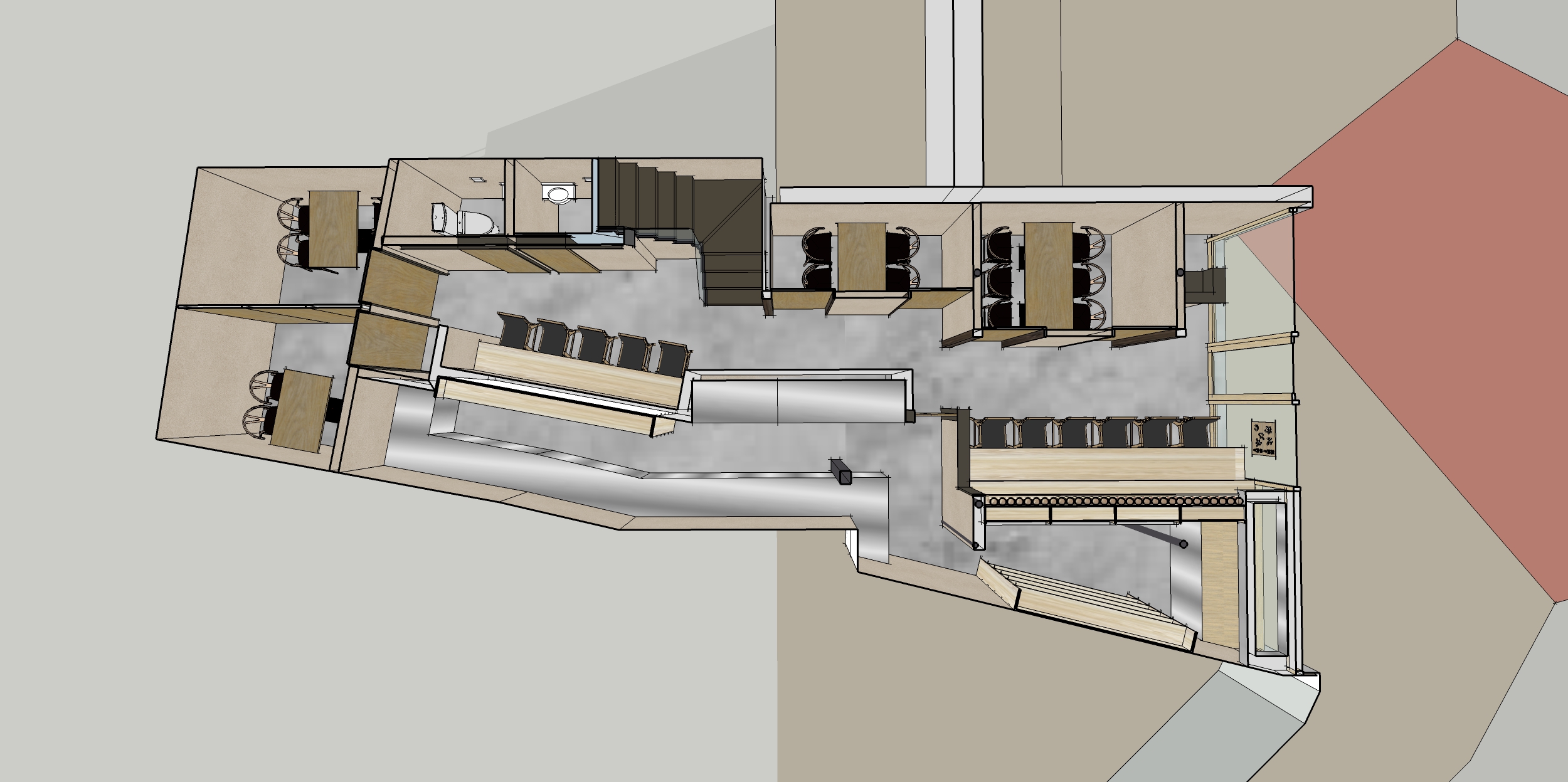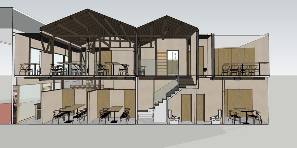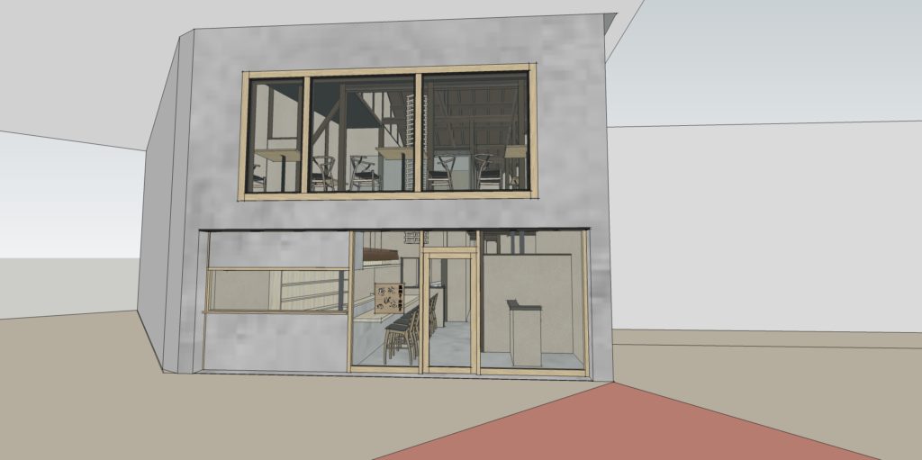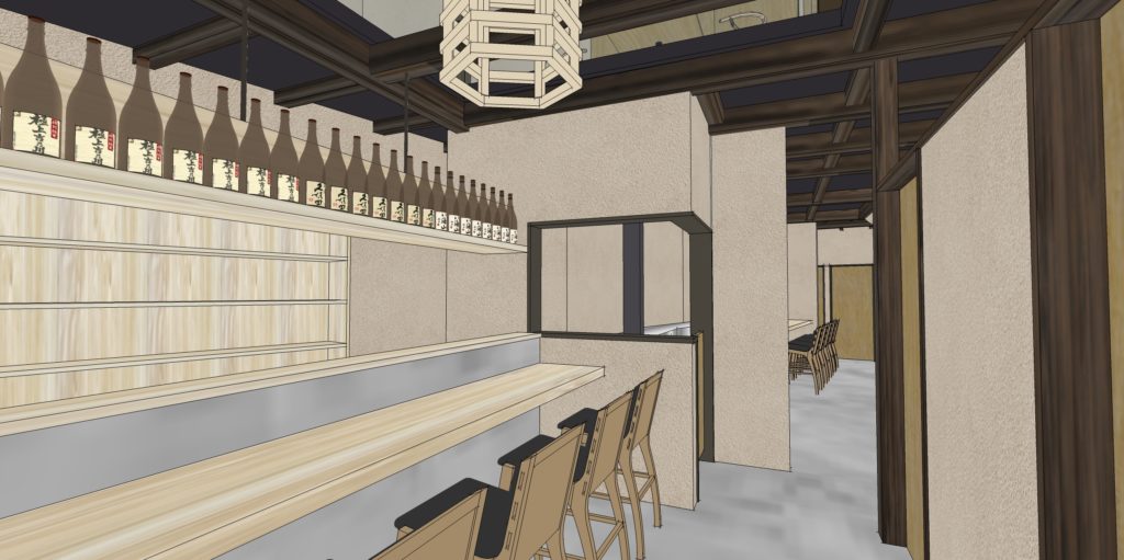 倉敷N店舗の修正CGパースです。 外観・内観にモルタル調デザインとし、若者が気軽に集まりやすいPOPな印象の店舗となるようにデザインしました。
