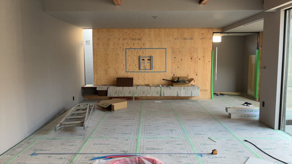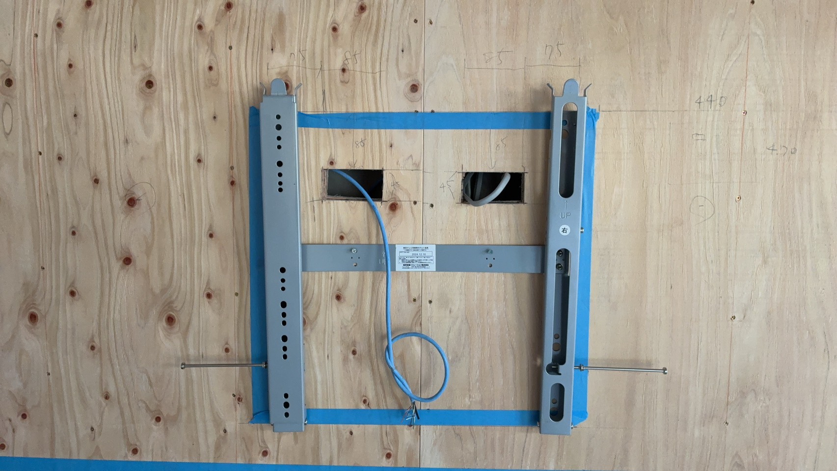 自邸兼モデルハウスの現場。いつもは現場監督にお願いしている、TVの金物を取り付けてみました。TVの中心高さが床から1.4mになるように、メーカーのHPの仕様寸法書から計算して取付けました。取り付け予定のTVは65型と少し小さめにしました。 今回の内装でLDKは、プラネットジャパンのフェザーフィールという自然塗料で塗装しています。 是非参考にしてみてください。