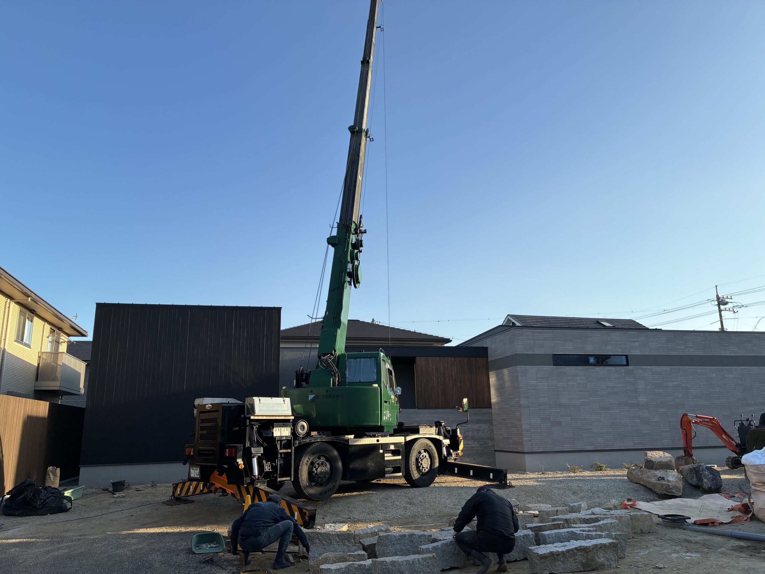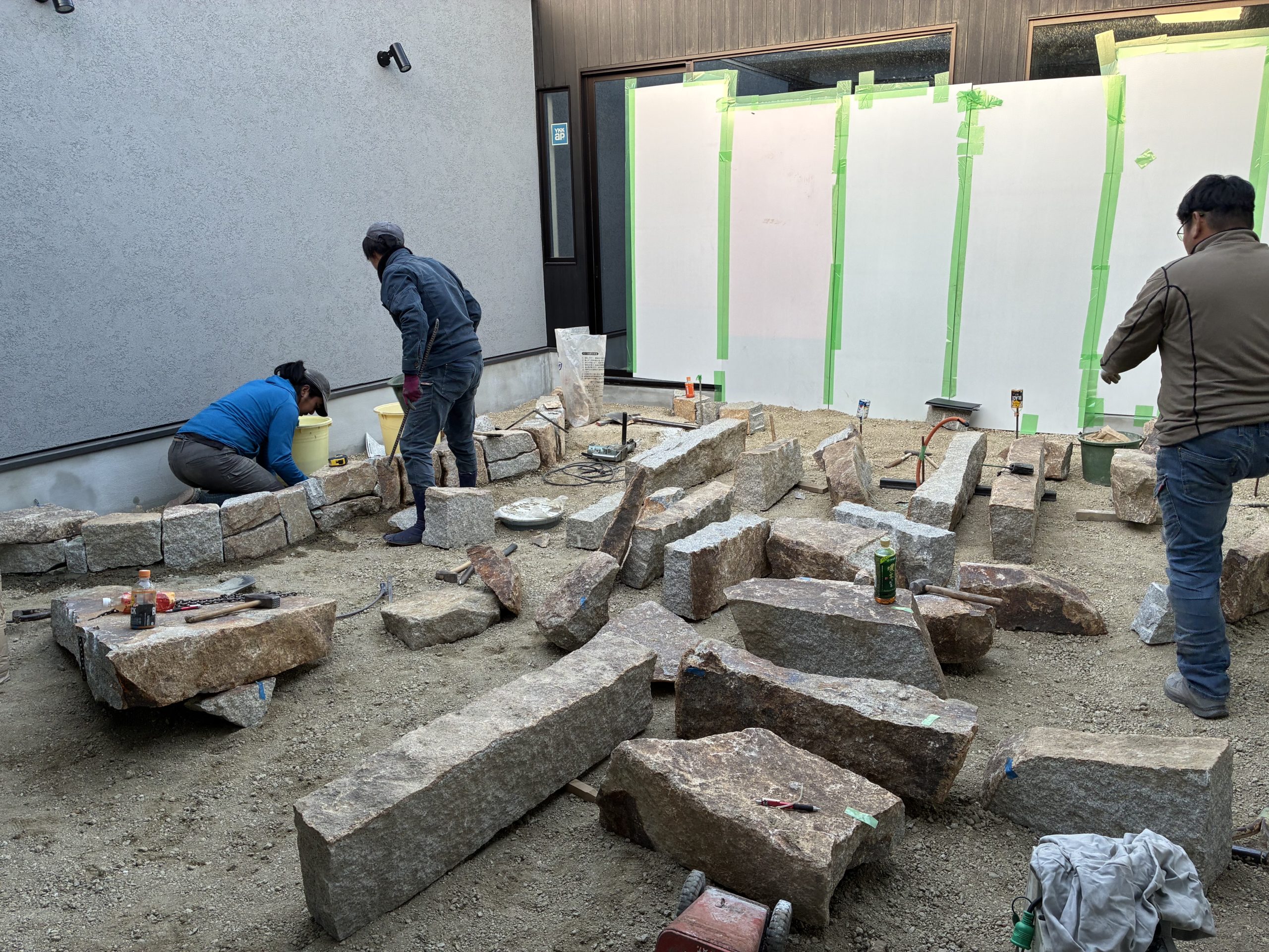 今日からAモデルハウスの中庭と外構の石積工事がスタートしました。 初日となる今日は、万楽園さんと一緒に石の積み方などを色々と相談させてもらいました。 さぁ、これから会社に帰って図面書きます💦
