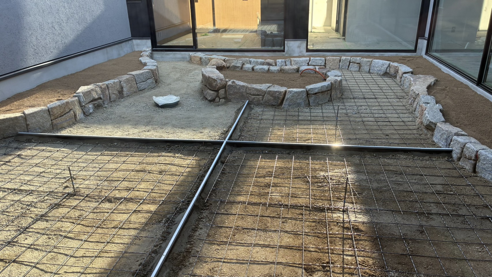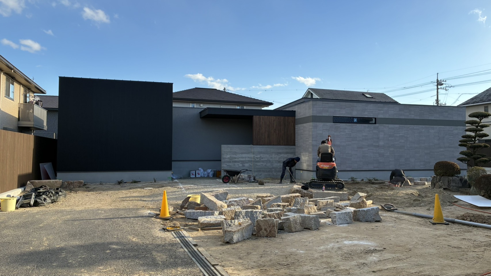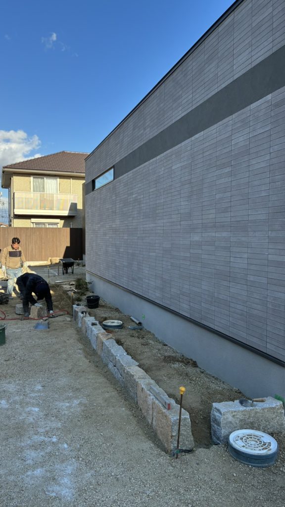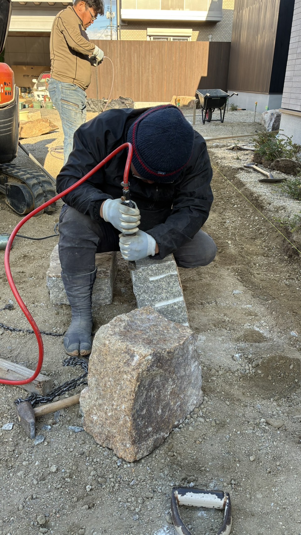 今日からAモデルハウスの中庭と外構の石積工事がスタートしました。 初日となる今日は、万楽園さんと一緒に石の積み方などを色々と相談させてもらいました。 さぁ、これから会社に帰って図面書きます💦