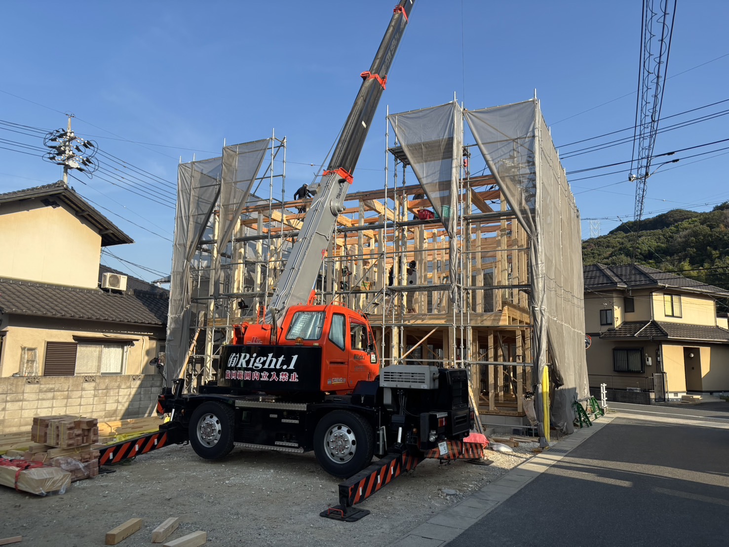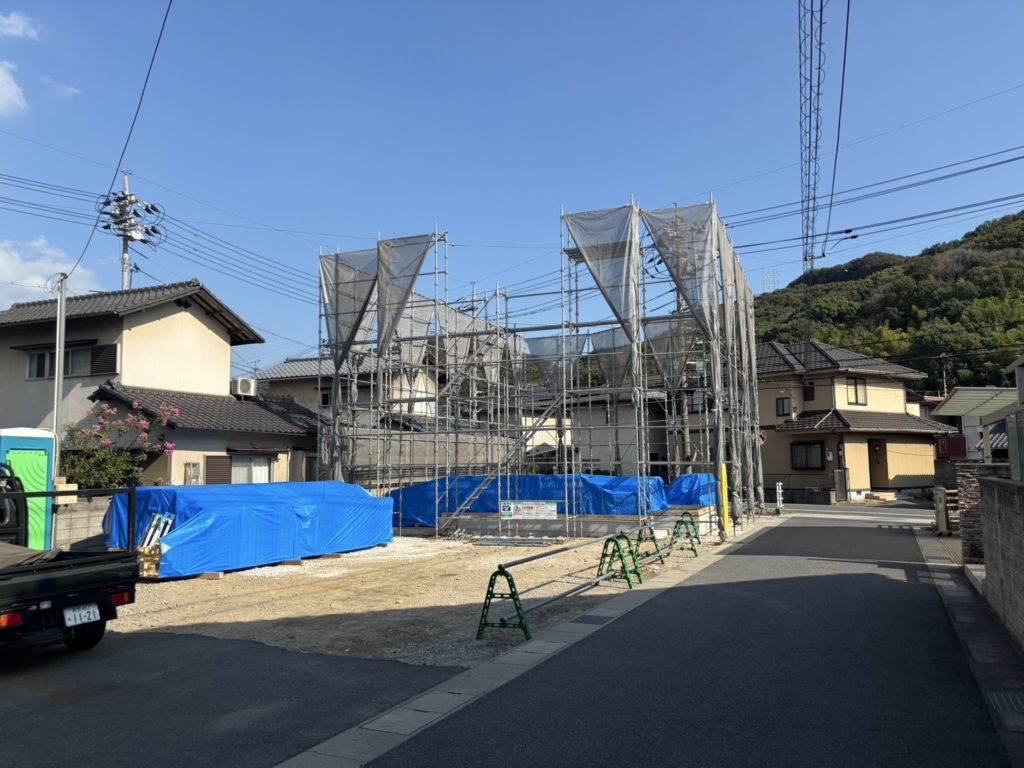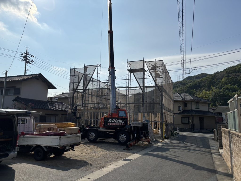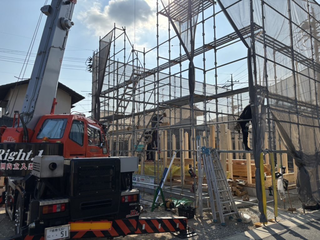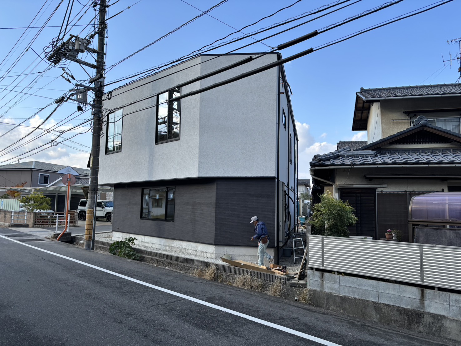 倉敷市堀南に建築中の工事も中盤に差し掛かり、今日から外壁タイル張り工事を行います。 ほか内部工事も順調に進んでおります。