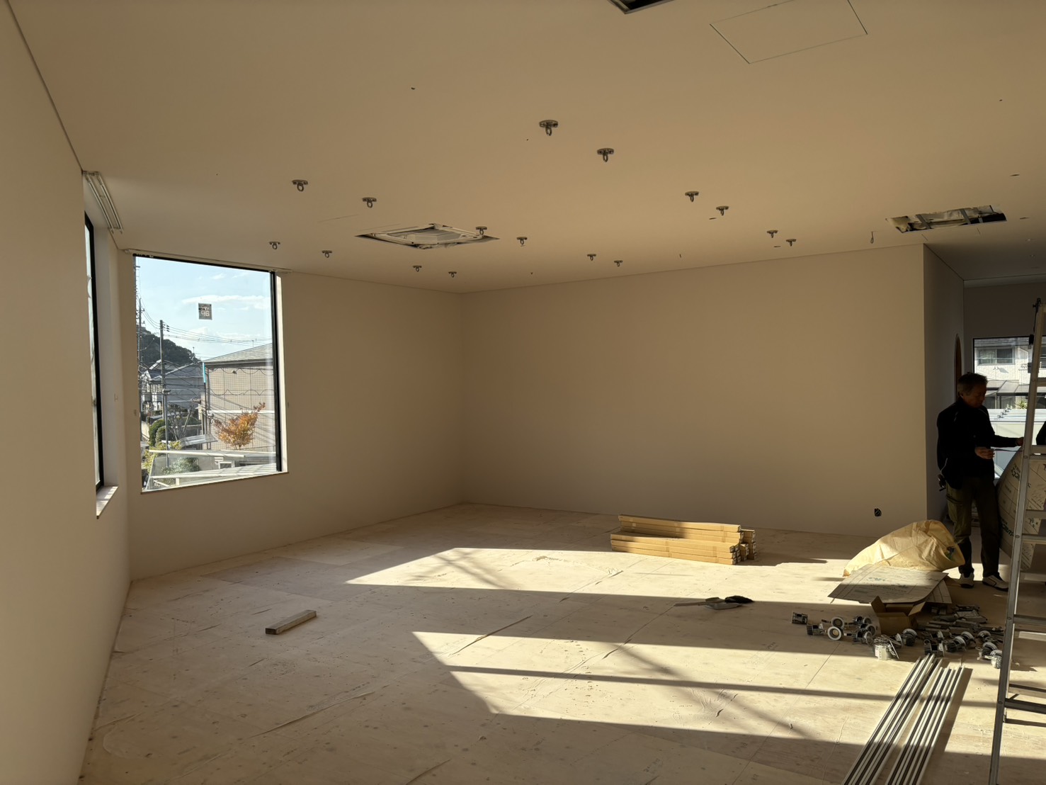 ピラティス貸店舗の現場も工事がだいぶ進みました。 今日は家具の取付や建具のつり込み作業が進んでいました。 このあとは内装工事と同時に外構工事も始まります。