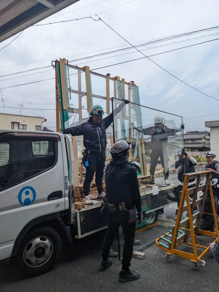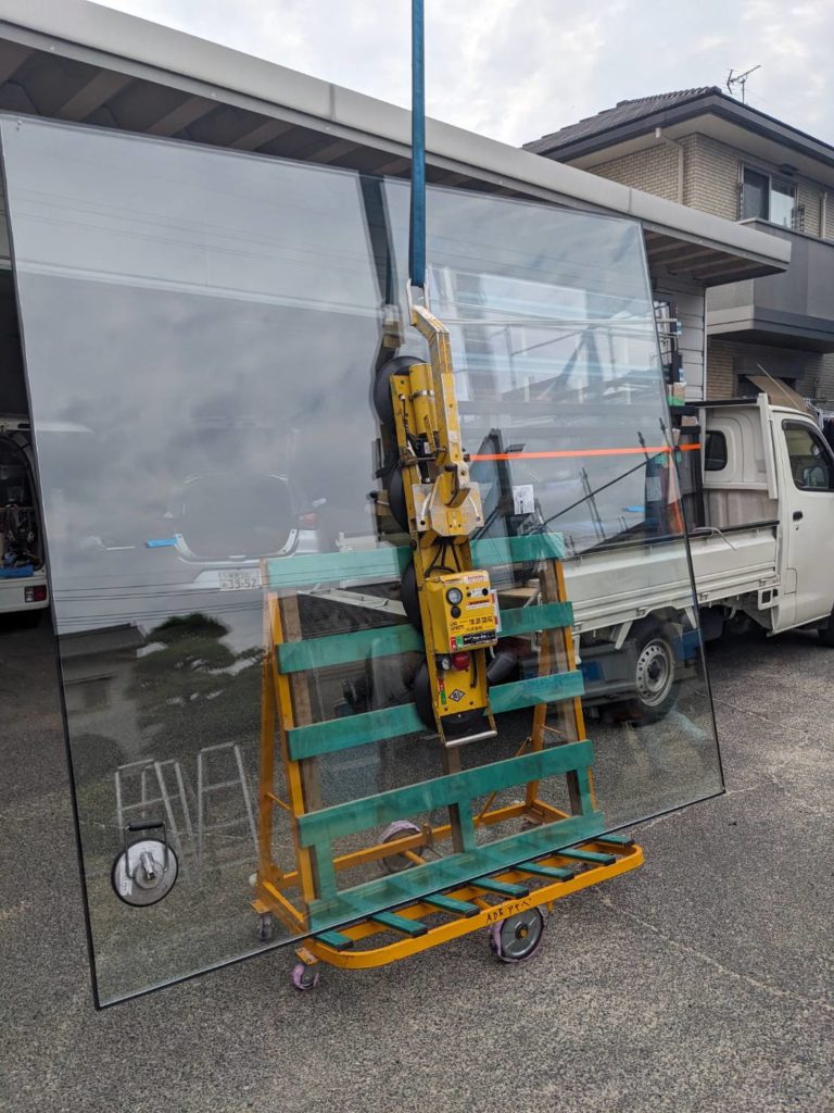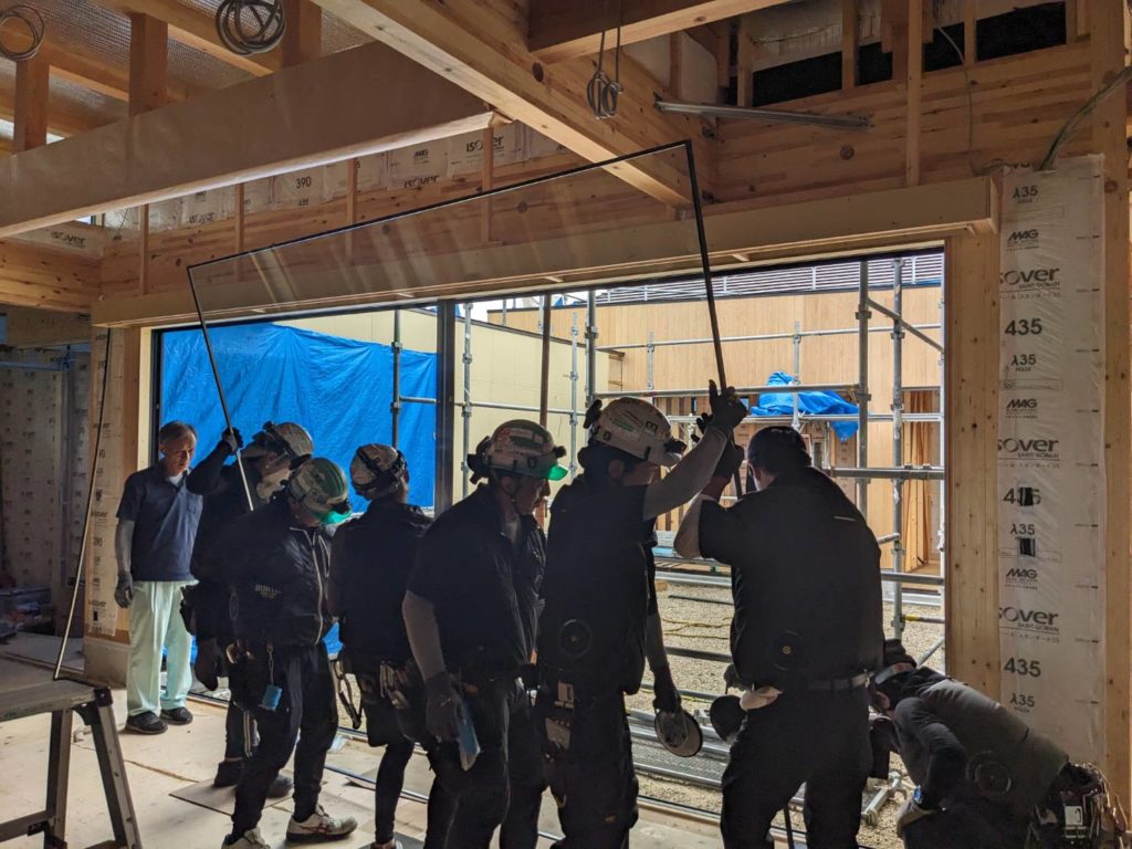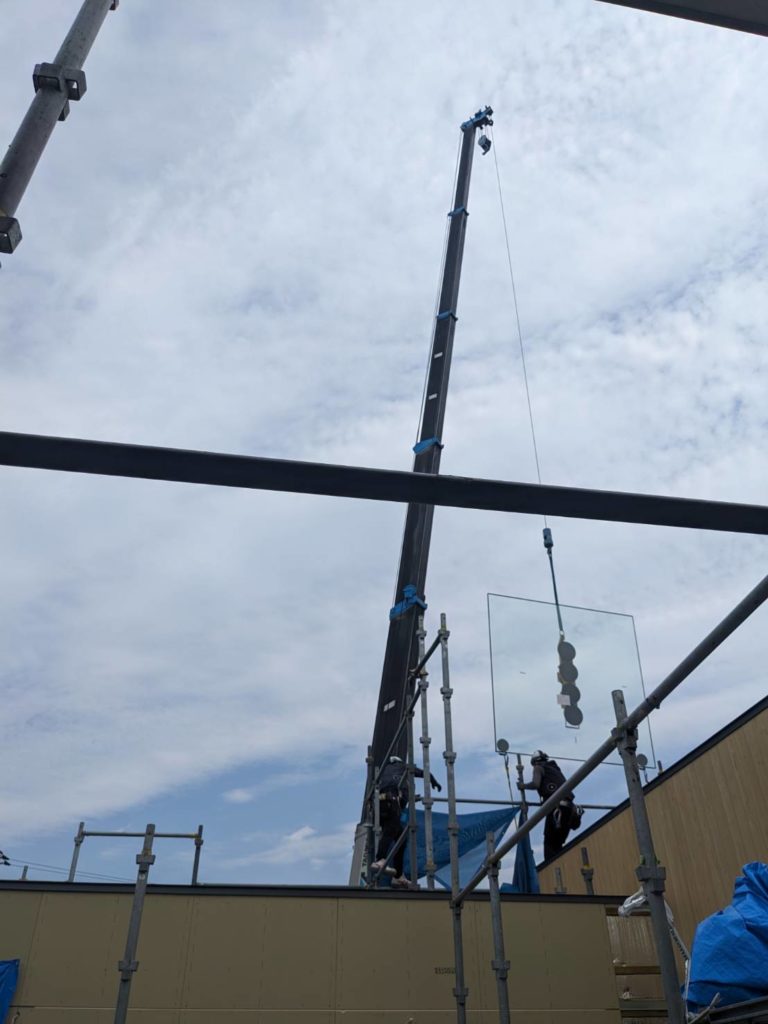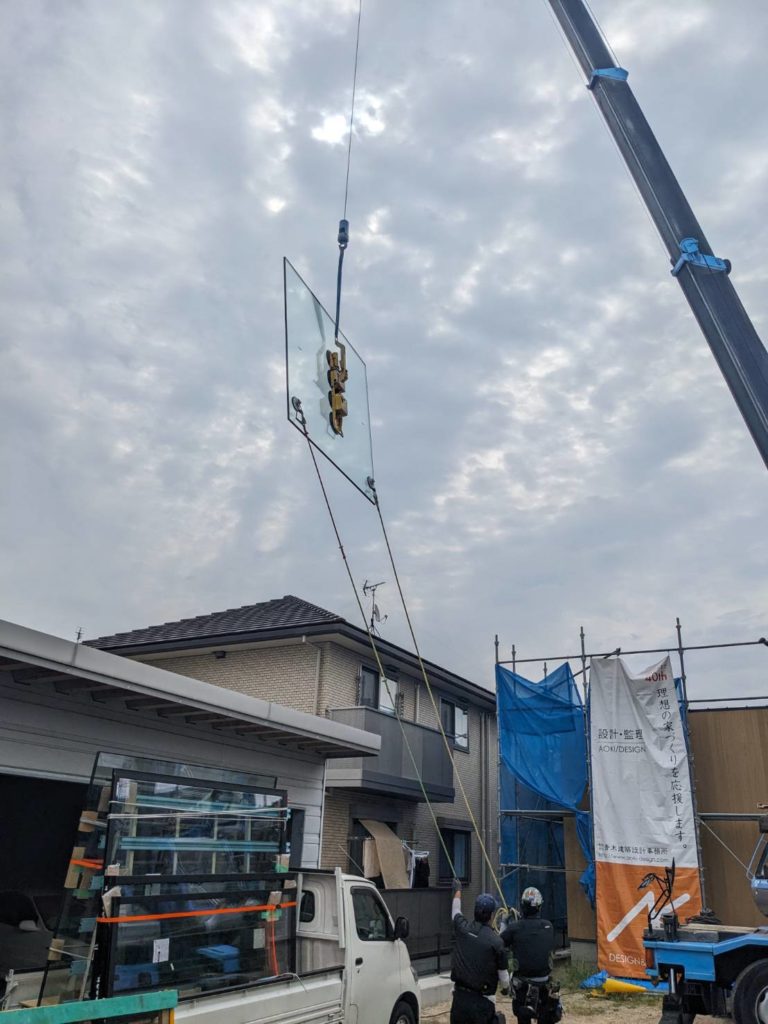 Aモデルハウスの中庭に面する超大型ペアガラスの搬入・取付作業が完了しました。ガラスの重量は一枚あたり約220kgあるのでレッカーで搬入しました。