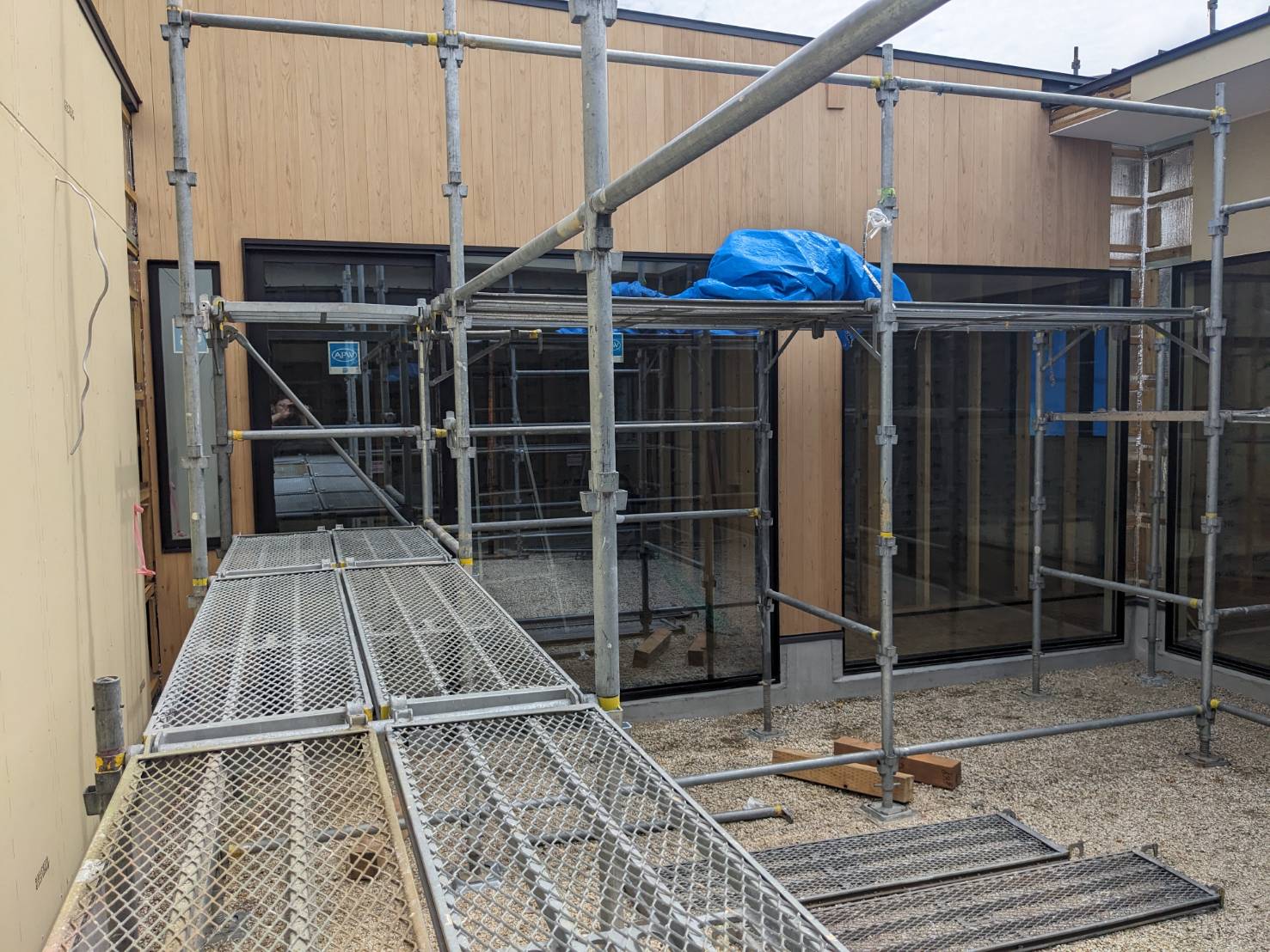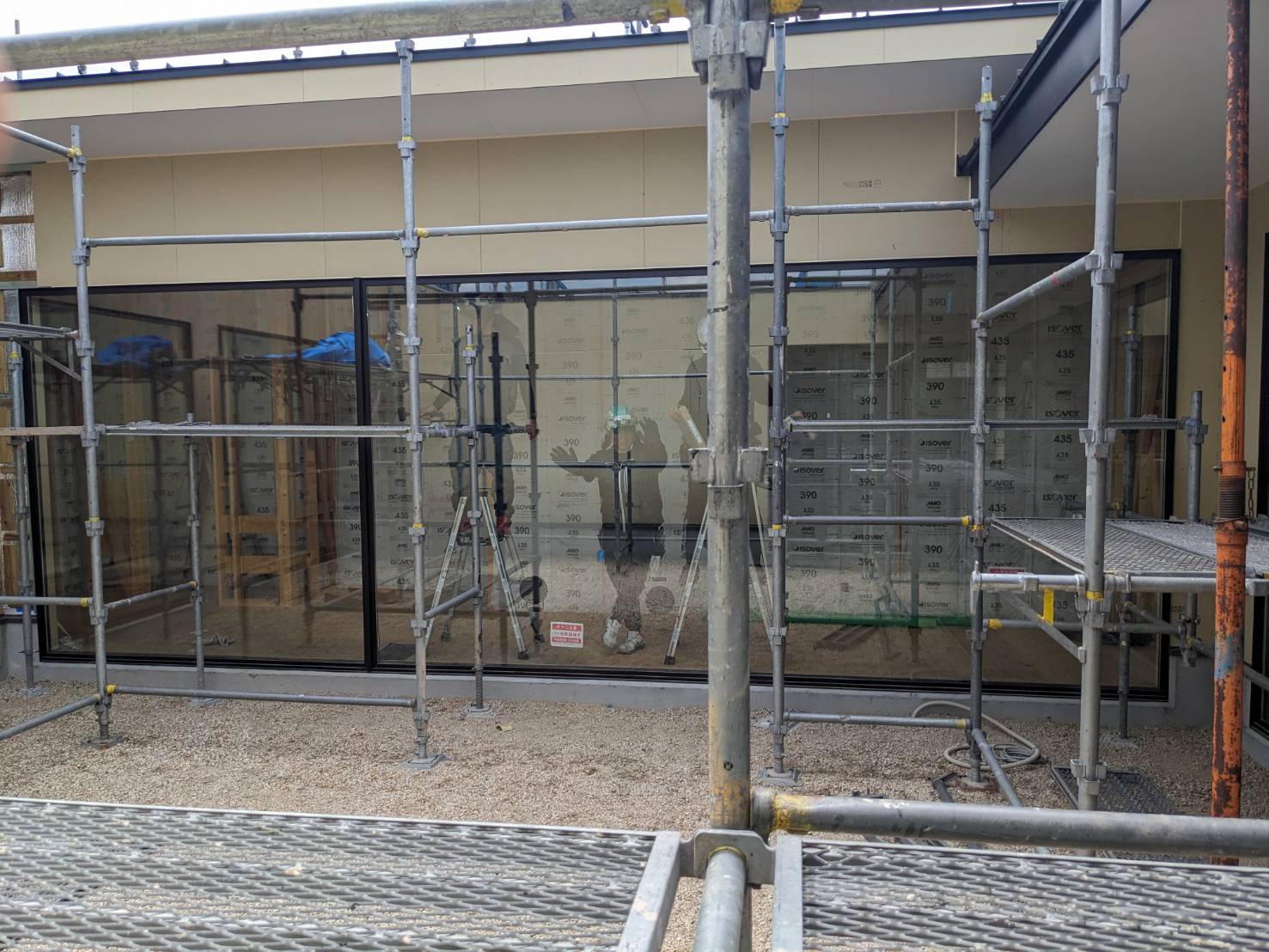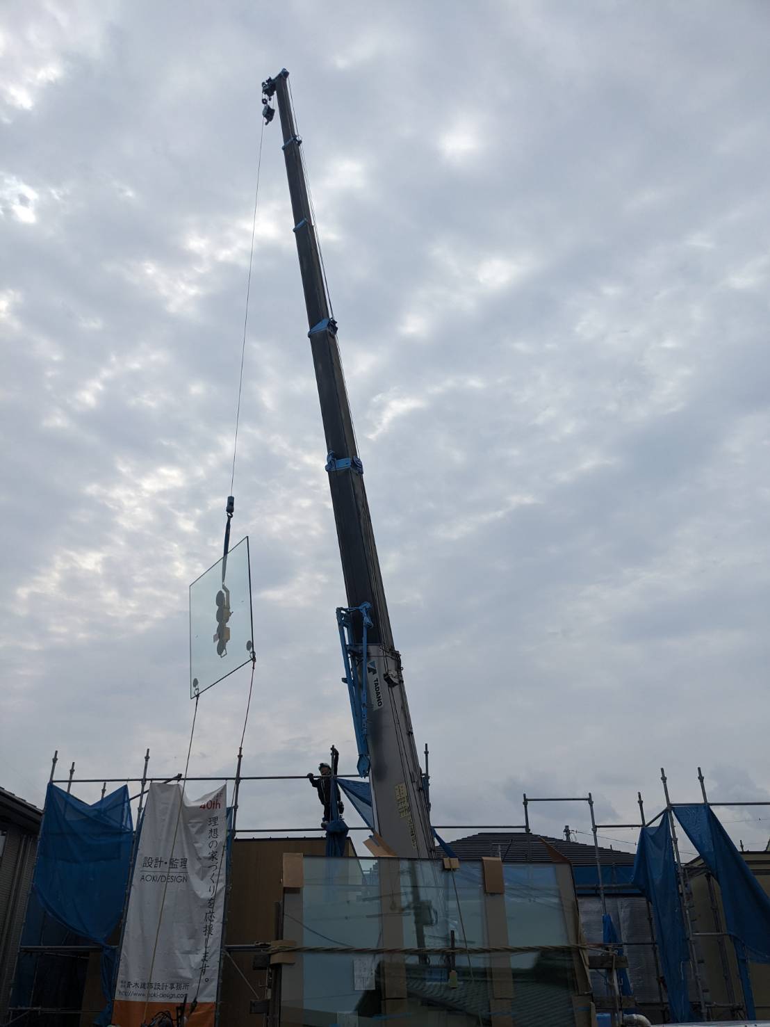 Aモデルハウスの中庭に面する超大型ペアガラスの搬入・取付作業が完了しました。ガラスの重量は一枚あたり約220kgあるのでレッカーで搬入しました。